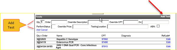 When you click on the Add Test link, the system displays all the fields necessary for you to add a new test. Click on the Add link to add the test, click on the Cancel link to discard new test data. After you click on either the Add or Cancel link, the system redisplays the list of tests for the accession.