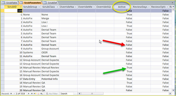 Using Access, navigate to the ScrubParameters table, scroll through the scrub ID records and change the Active field to True or False to activate or deactivate each scrub ID.