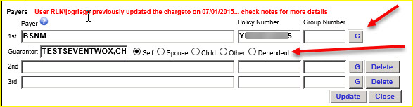 Guarantor Information: In the Payers area, click on the G button to add or change Guarantor information as needed for each Payer. The G button is a toggle to display and hide the Guarantor information for the Payer.