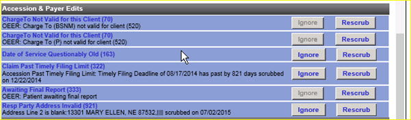 Click the Ignore button to perform an override, to let this accession bill without making a correction to the accession for this particular scrub. Fusion does not look again to check that this edit was corrected prior to pricing and billing.