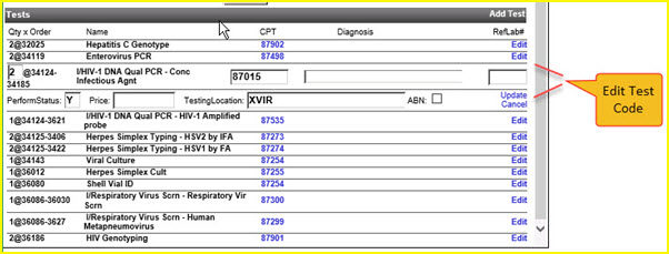 For example, clicking on the Edit link on the 3rd test record, CPT 87015, provides access to the data you may change for that test.